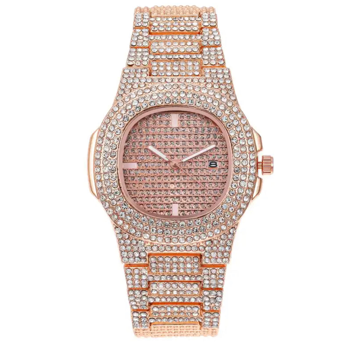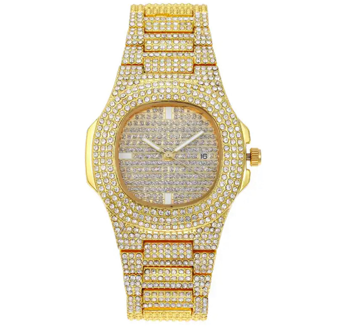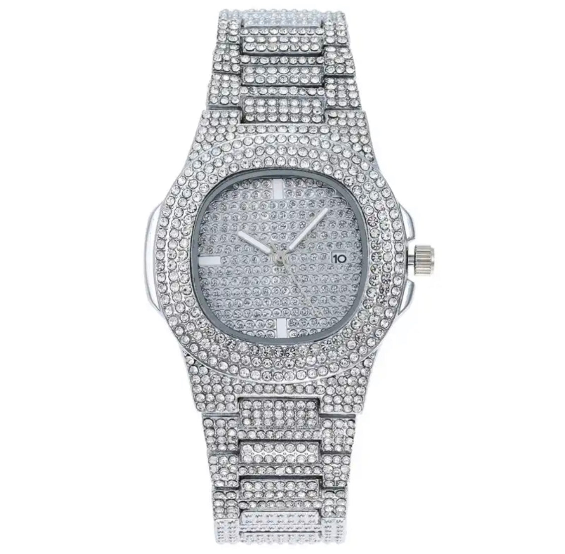 - Feature: Iced out, Datumanzeige, Leuchtende Zeiger, Stossfest, Wasserdicht